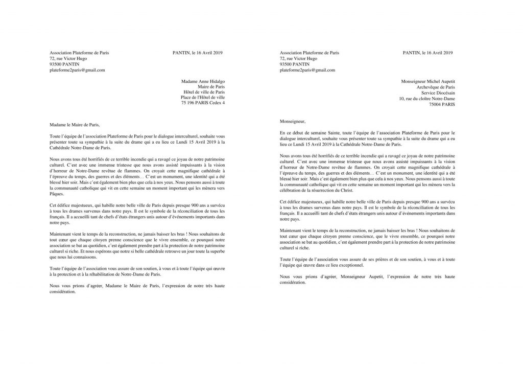Suite à l’incendie dramatique qui a ravagé notre belle cathédrale Notre-Dame de Paris, l’association Plateforme de Paris a décidé de s’adresser au Diocèse de Paris et à Madame le Maire de Paris afin de leur présenter leur entier soutien face à cette tragédie qui a touché un des joyau de notre patrimoine culturel français…